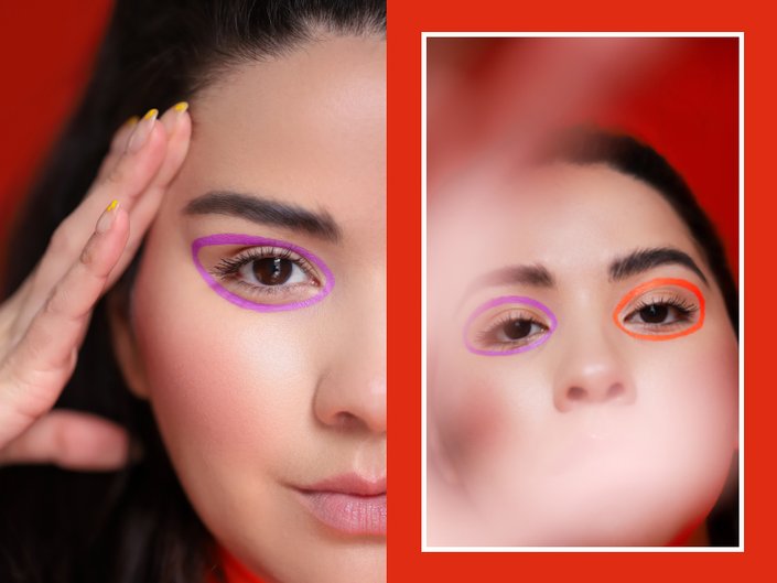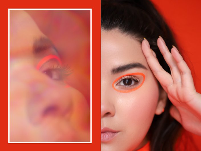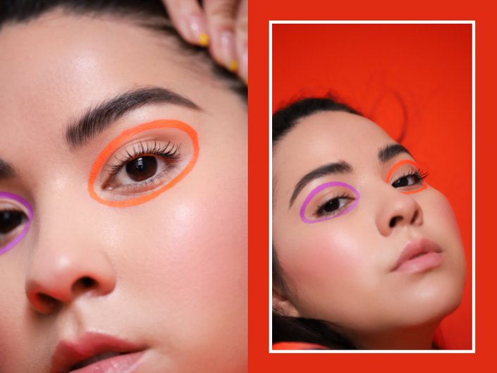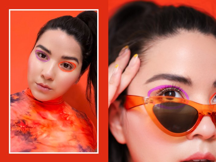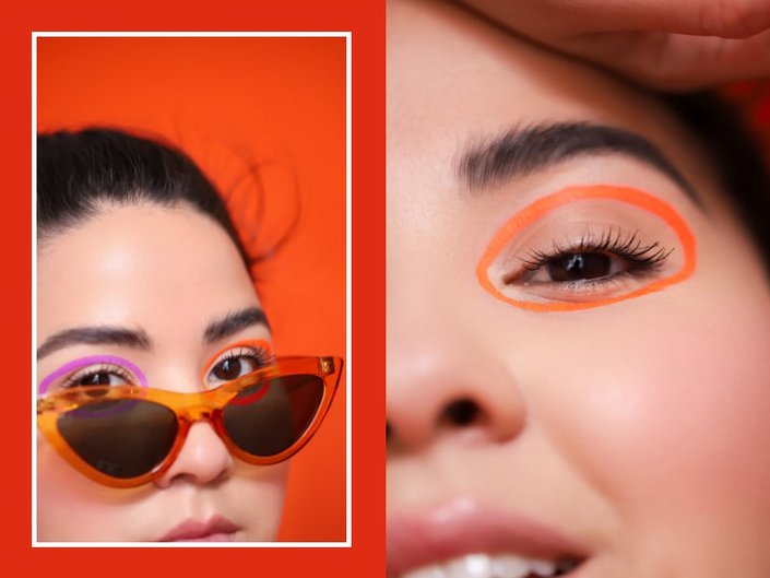 Now that one eye is complete, repeat the process on the other eye. SanVincent-Landestory swapped out her purple shade for a bright orange, like the NYX Professional Makeup Vivid Brights Cremé Color in Cyberpop. Don’t worry about making your eyeliner perfectly symmetrical. It’s a graphic, offbeat look — have fun with it!