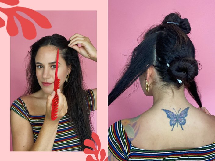 The first step to styling your hair in summer is to start with clean damp hair. Burnside says she likes to towel-dry her hair prior to styling to remove excess moisture.