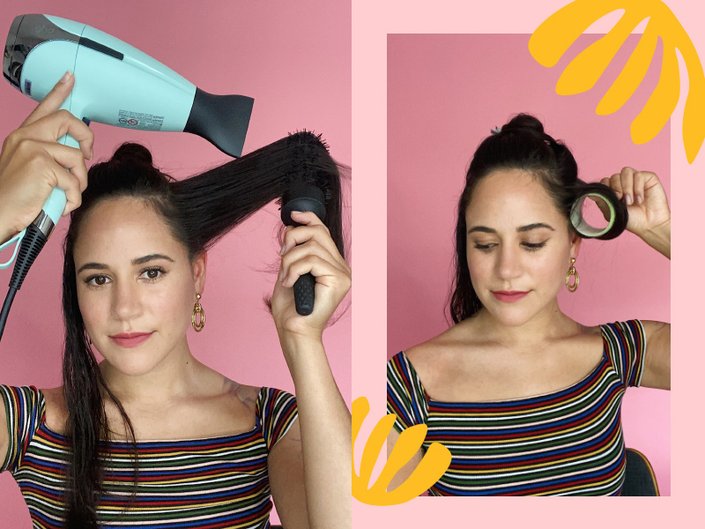Once your hair is sectioned, blow dry the sides first using a round brush. If you want the hair to have more movement and bounce, use a wider round brush. Pro tip: Burnside recommends wrapping your hair in a velcro roller as soon as you finish blow drying each section to let it cool and help extend the life of your style. It also helps to create even more volume at the root. After you do the sides of your hair and set them in the velcro rollers, Burnsides recommends moving to the middle section. Beginning from the nape of your neck, continue to blow dry and set your hair in the rollers until you get to the crown of your head.