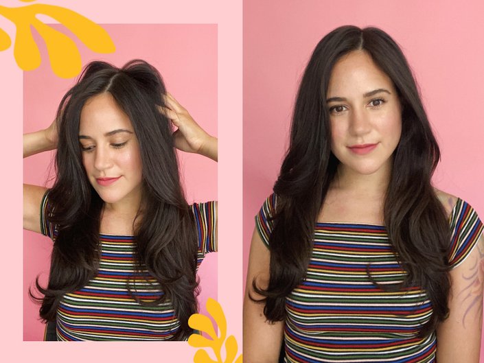 Burnside recommends applying a leave-in conditioner from the mid-lengths to the ends of your hair to give moisture, and use a volumizing primer at the roots to add extra lift and volume. Then, she recommends using the L’Oréal Paris Elvive Dream Lengths No Haircut Cream to help reduce frizz. It also provides heat protection and helps lock in your style.