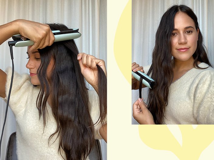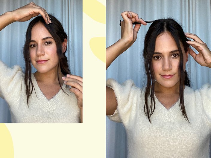 One of the best things about this hairstyle is that it can be created on clean or second- or even third-day hair. If it’s been a few days since your last shampoo, Burnside recommends hitting your roots with a dry shampoo to start. Next, she suggests giving the hair texture with some flat iron waves. “Section hair and start by rotating the iron downwards and then alternating your wrist upwards,” she says. “Repeat as you work down the section to create a natural S-wave.” To lock in the waves and give your hair even more texture, mist a product like the Garnier Fructis Style De-Constructed Texture Tease Dry Touch Finishing Spray throughout hair.