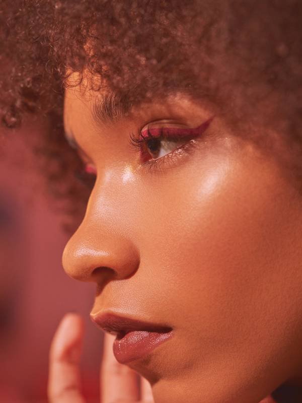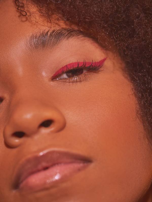 For the cranberry red winged eyeliner, use the L'Oréal Paris Matte Signature Liquid Dip Eyeliner in Burgundy across the whole lid. According to Williamson, the trick for winged liner is going back in with a Q-tip dipped in micellar water to clean up underneath the flick to make sure it’s really sharp.