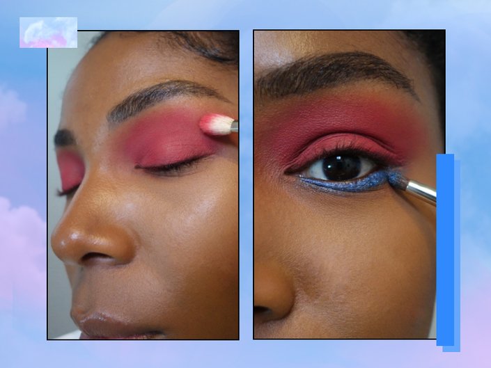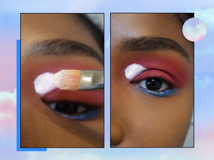 While you can use any color across your lid and under your lash line, we’re loving this red and blue combination. To get this look, Williamson used the NYX Professional Makeup Escape Artist Shadow Palette. Using a fluffy shadow brush, she dipped into the red shade and washed the pigment across her entire lid, from lash line to brow bone. “Just softly diffuse it out to the edge of the eye and into the inner corner as well — you’re going to want the color to surround the cloud,” she says.