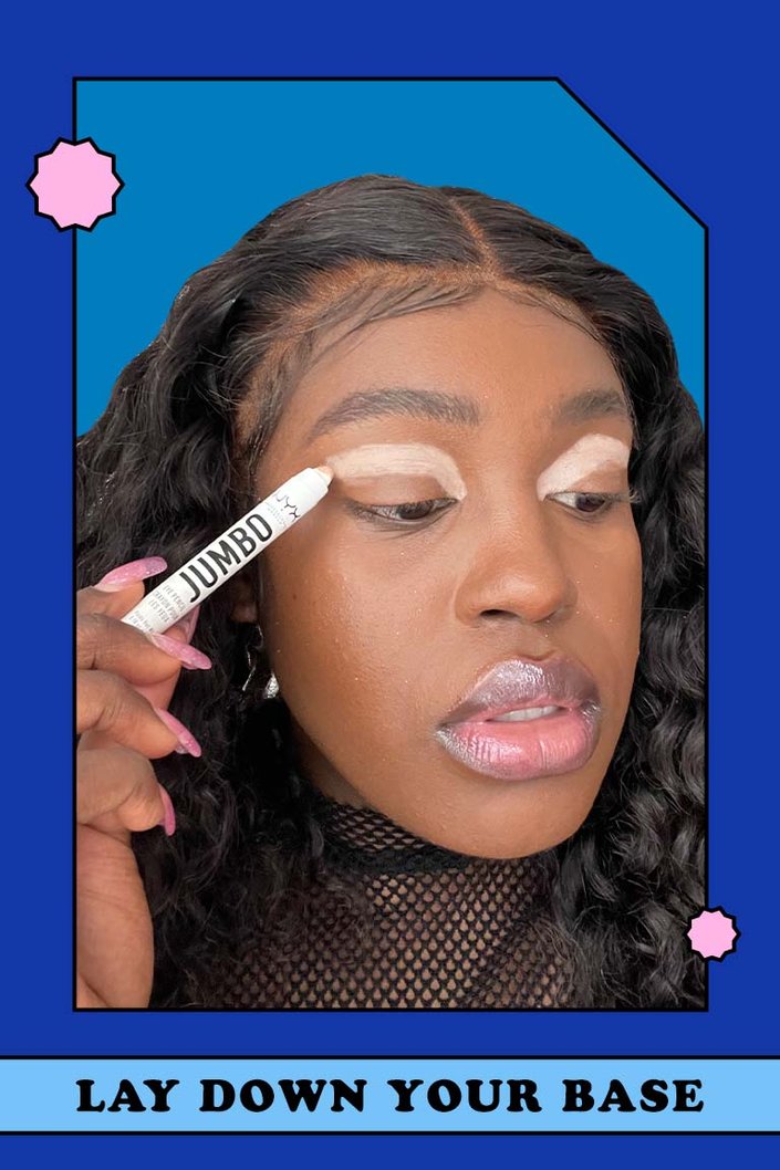 Start the look off by prepping the eyelids for a bold eyeshadow color. Using the NYX Professional Makeup Jumbo Eye Pencil in Milk, create a half moon shape starting at the inner corner of the eye and dragging it along the crease to form a base for the eyeshadow. Then, using a flat eyeshadow brush, blend the milky shade out.