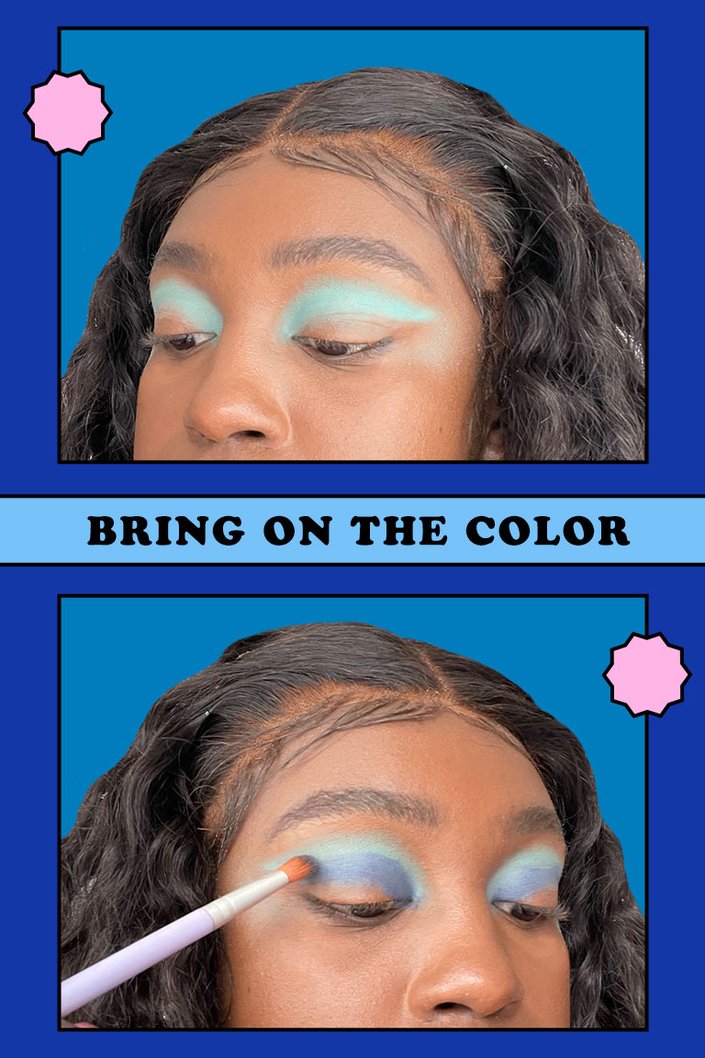 Then, grab a powder eyeshadow in a similar color — in this case NYX Professional Makeup Hot Singles Eyeshadow in Electroshock — and lightly apply it in the center of the two shades of blue for a seamless-looking transition. Take that same powder shadow and apply it to your bottom lash line with a tiny tipped eyeshadow brush.