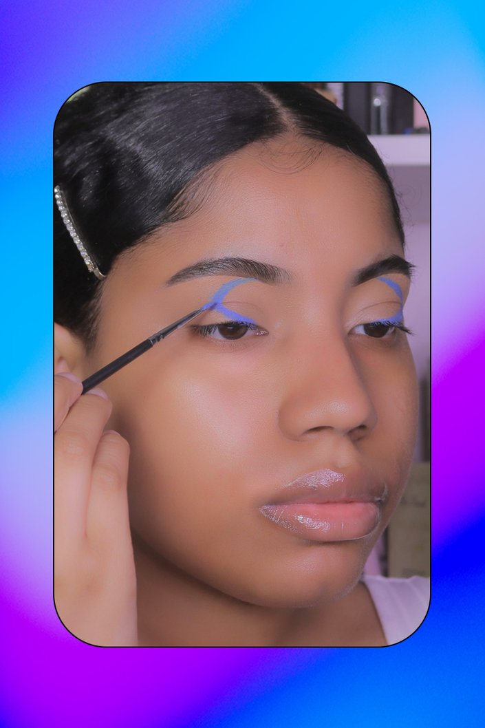 Using the Urban Decay 24/7 Shadow Stick in Chaos, start at the inner third of your upper lash line and apply the pigment in a “C” shape up to the brow. If you prefer to use a liquid formula, we recommend the L’Oréal Paris Matte Signature Liquid Dip Eyeliner in Blue.