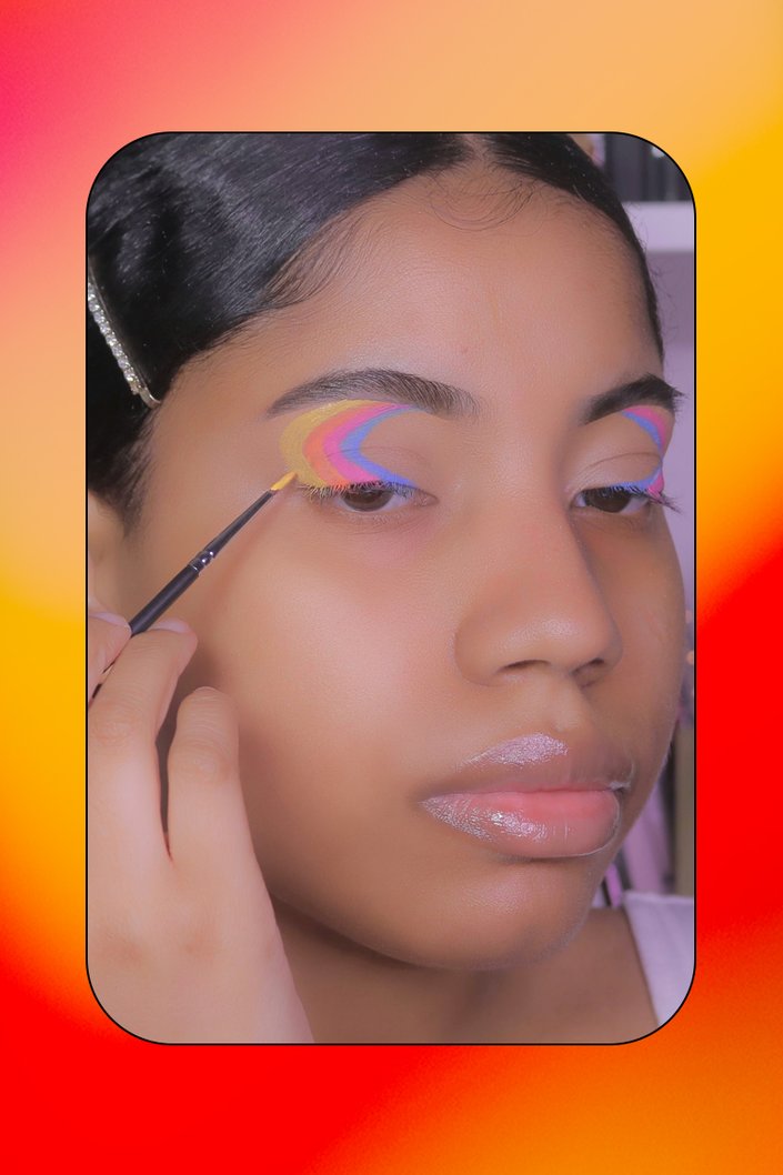 Using the NYX Professional Makeup SFX Face and Body Palette in Brights, continue building on the shape with three additional shades, making the last curved line the thickest. Here, Janea used the hot pink, bright orange and yellow shades from the palette.