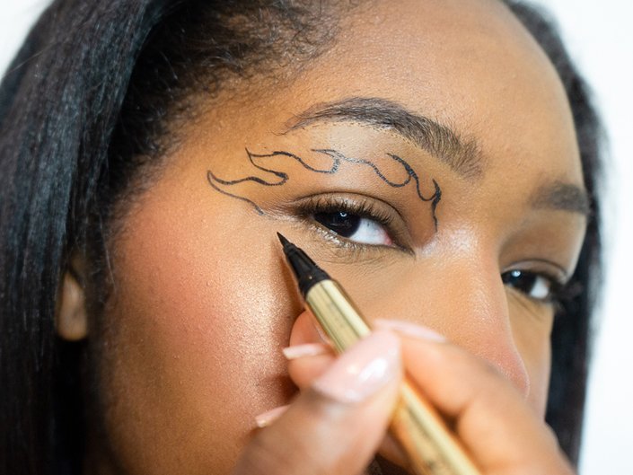 STEP 1: Draw Your FlameTo start the look, use the NYX Professional Makeup Epic Ink Liquid Liner in Black to draw the flame outline. When drawing your flame, feel free to freehand it and get creative as you extend the outline from the inner corner to the outer crease. Make your flames as big or as small as you like. ![]()