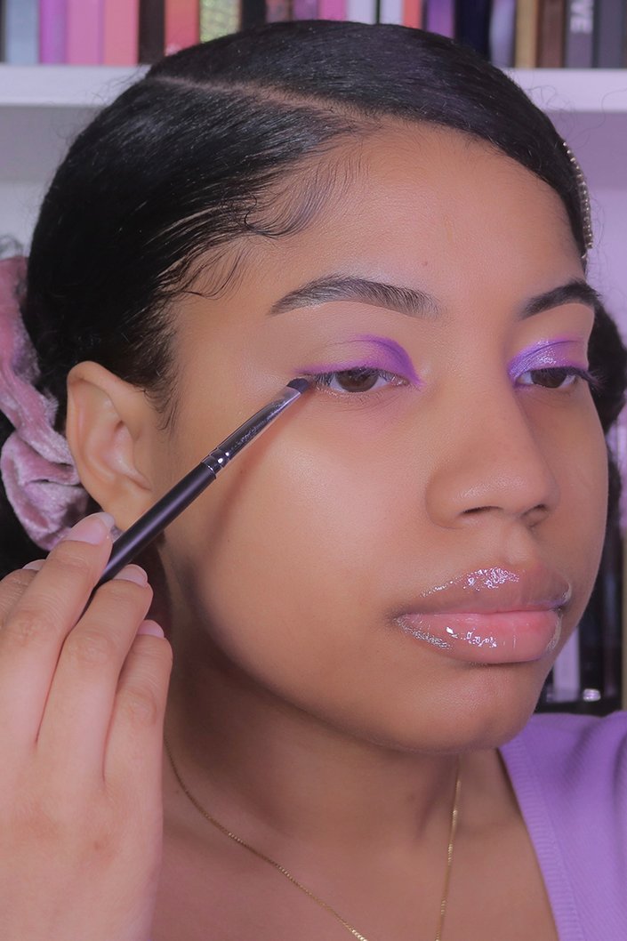 Next, using the Urban Decay Naked Ultraviolet Palette, you’re going to apply the purple shade Warning in the inner corner and blend it out using a fluffy eyeshadow brush until it reaches the middle of your eyelid. You’re also going to apply that same shadow on the outer corner of your eye along your upper lash line to create a small wing.