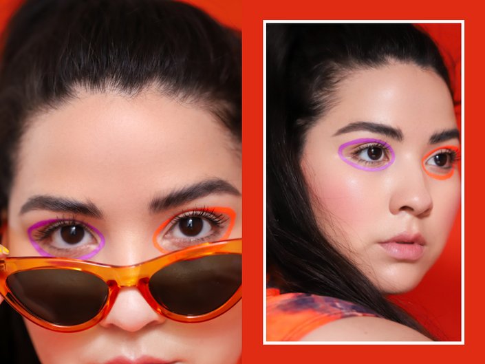 Now that one eye is complete, repeat the process on the other eye. SanVincent-Landestory swapped out her purple shade for a bright orange, like the NYX Professional Makeup Vivid Brights Cremé Color in Cyberpop. Don’t worry about making your eyeliner perfectly symmetrical. It’s a graphic, offbeat look — have fun with it!