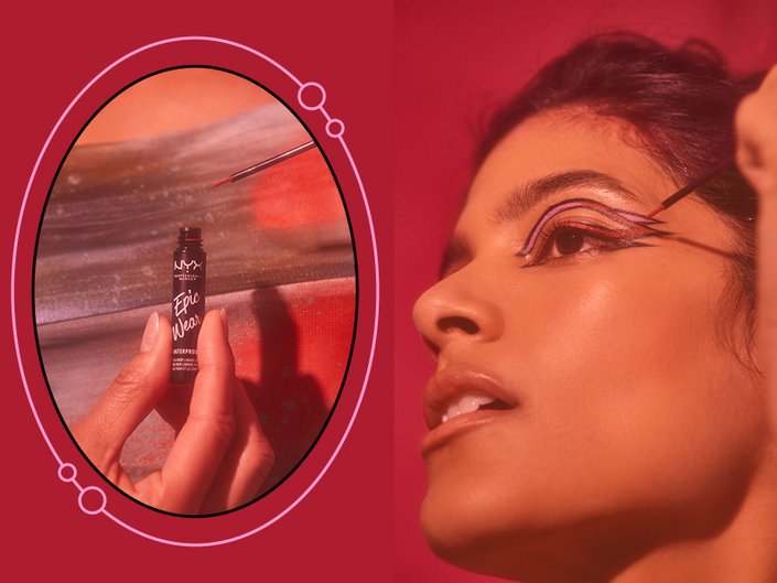 Using a black liquid liner — our favorite is the NYX Professional Makeup Epic Wear Liquid Liner in Black — outline your multi-layered shape. Start by creating a regular cat eye and extending the wing all the way to the temple of your face. Next, create a round halo starting from your inner corner and connecting it outward to the wing you just created.