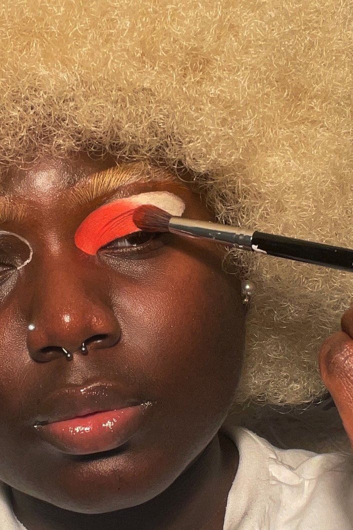 After your oval shape is done, apply Slowburn from the Urban Decay Wired Palette, a bright red shade, on the inner corner and take it to the center of the lid. Then, apply the shade Savage from the same palette, a bright neon pink shade, on the outer corner up to the center of the lid. The key to creating a gradient look is to blend, blend, blend the two colors until there are no harsh lines where they meet.