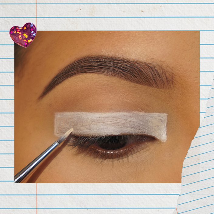 Next, draw your first rectangle using either a very light concealer and a fine-tip eyeliner brush, or the NYX Professional Makeup Jumbo Eye Pencil in Milk. Keep your eyes open and draw the edge of your rectangle,beginning at the inner corner of your eye and taking it up into the crease. Then, draw a line across your entire eyelid until you get to the outer corner of your eye. Close up the rectangle by drawing your final line connecting that horizontal line across the lid to the outer edge of the upper lash line. Next, fill in the rectangle with the white base.