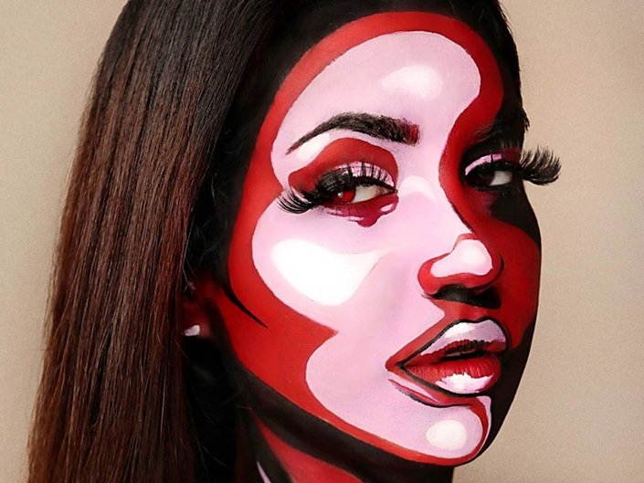 We’ve seen pop art graphic eyeliner and lip liner on our social media feeds before, but @paintedmina takes the trend to a whole different level by transforming herself into a poster girl.