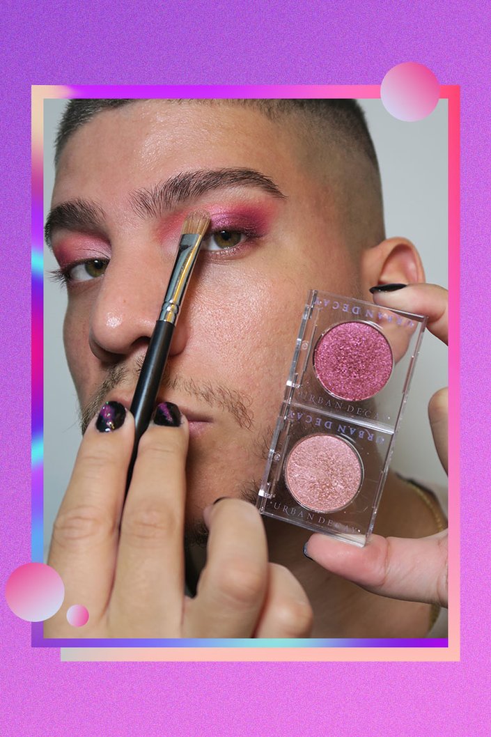 Because this look features bright, bold colors, Rodriguez recommends starting with the eyes. “If there’s any fallout it’s easier to clean up without having to worry about ruining any makeup underneath,” he explains. Prep your eyelids with an eyeshadow primer, like the Urban Decay Eyeshadow Primer Potion. Then, using a medium-sized fluffy brush, blend a light, peachy-pink eyeshadow (like Gadget from the Urban Decay Naked Cyber Palette) into the crease of your eye. “You want to blend this out almost in a straight line, connecting the tail end of your eyebrow to the beginning of your brow,” Rodriguez says. “It’s okay if it’s a bit messy because you’re going to be adding more colors.”