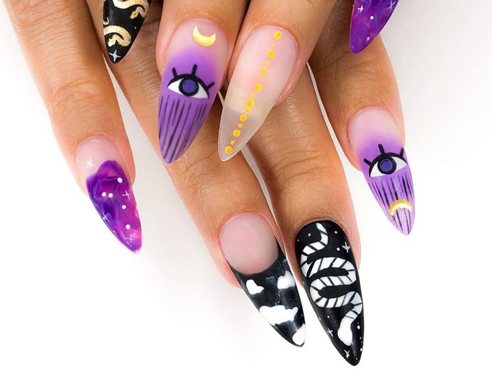 Decorated with silhouettes of bats, a moon and a Ouija board planchette, this black and white manicure gives a whole new meaning to coffin nails.
